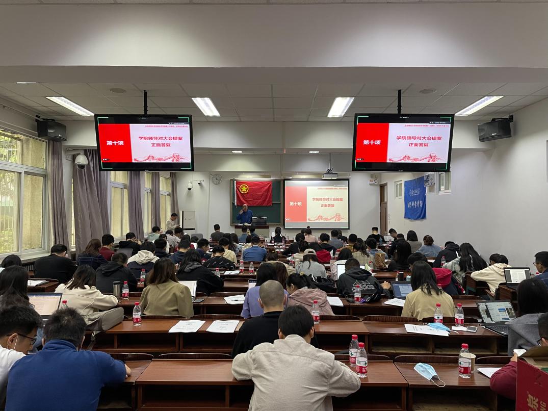 经筹备委员会确认,本次大会共收到13名代表的若干提案,内容涉及教学、科研、生活、心理、就业等方面。之后,党总支副书记周亚认真地回复了每个提案。他指出,学院未来将会继续推动“党建促院建”的发展目标,加强学科建设,深化研究生评价体系,完善学院各项管理制度,强化各部门工作职能。学院鼓励同学们自组织建立各类活动平台,并提供经费、场地等资源支持,促进学院形成良好的学术氛围。他表示,学院将努力在学习、科研、生活等方面为同学们创造良好的条件,并随时接受同学们的监督。