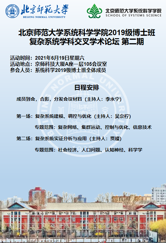 为营造良好的班级学术氛围,促进19级班内同学间的学术交流,了解不同研究组的前沿方向进展,鼓励同学之间的学术合作。2019级博士班于2021年6月19日在京师科技大厦A座一层105会议室举行了“复杂系统学科交叉学术论坛(第二期)”。