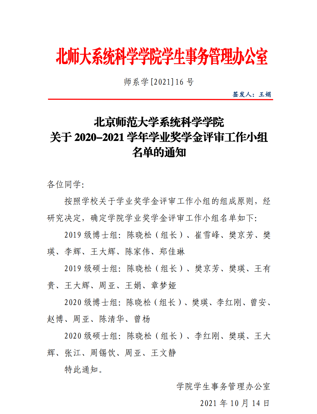 关于2020-2021学年学业奖学金评审工作小组名单的通知