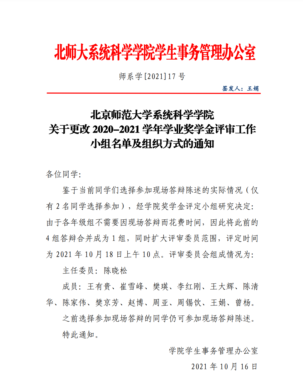 关于更改2020-2021学年学业奖学金评审工作小组名单及组织方式的通知