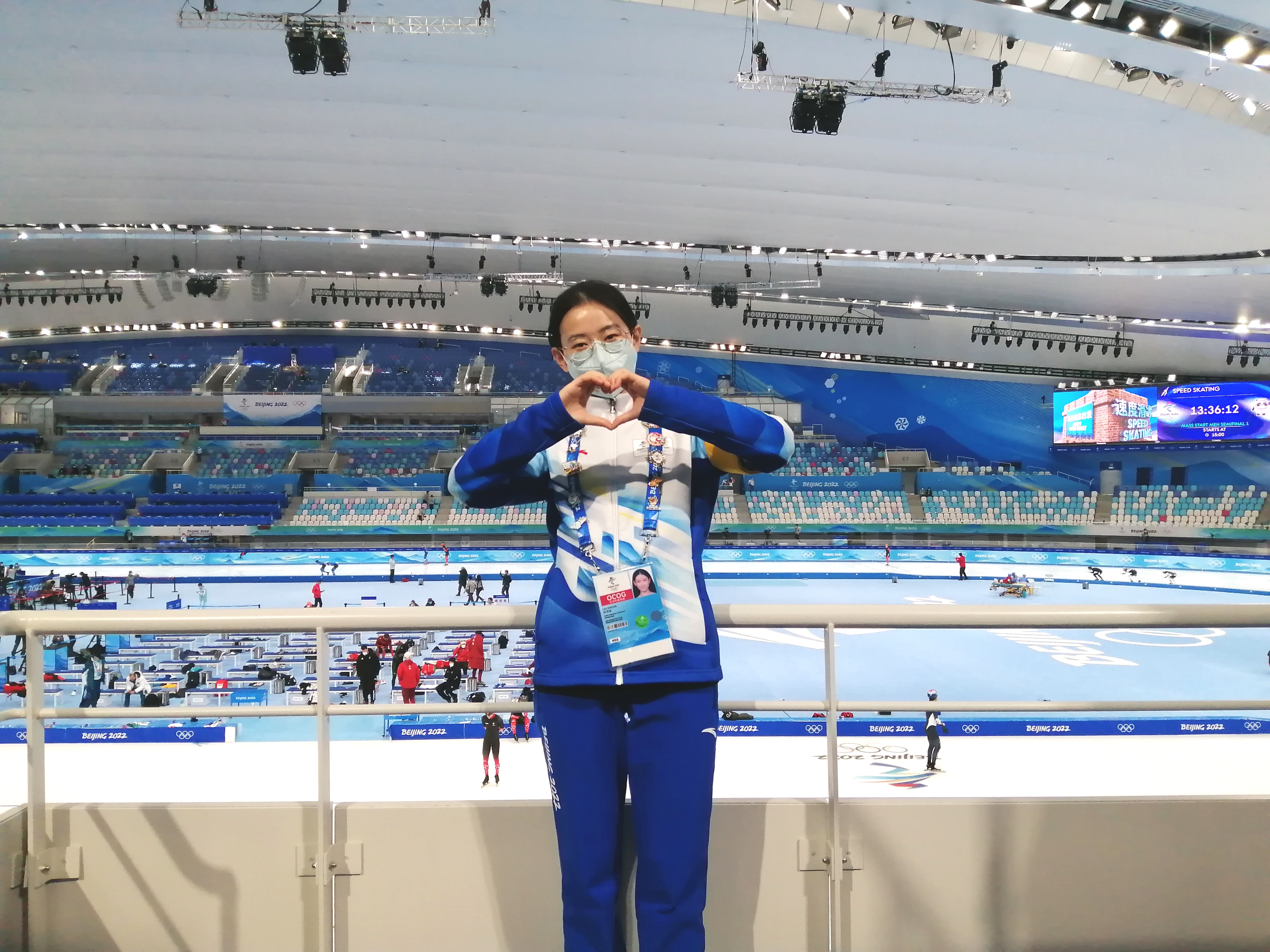 今天是2月14日,北京2022冬奥会已过半程,我很荣幸成为赛事服务领域的一名志愿者。我的岗位是看台引导,主要负责赛前引导观众快速入座,赛后疏导观众有序离场,赛时时刻关注观众是否佩戴好N95口罩,提醒观众们注意防疫要求和观赛行为准则等。在条条框框严格的工作要求之外,我们最大的期待还是希望观众能体会到宾至如归的感觉。负责看台引导的志愿者的工作点位是在比赛的场馆内,因此很感恩能够有机会亲身感受到比赛现场的氛围以及亲眼见证多次新的奥运纪录和一次新的世界纪录,更是为中国在冬奥会速滑项目上的男子首金感到无比兴奋和自豪!