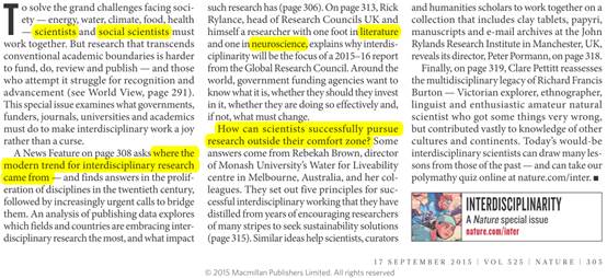 文章大意是说,为了解决现在我们所面临的各种挑战,须要不同学科的科学家互相合作,来解决这些重要的跨学科的问题,而且未来研究的重心也将是interdisciplinary(交叉学科)!甚至还有人写文章说有五个原则对成功进行interdisciplinary(交叉学科)很有帮助。系统科学作为典型的交叉学科,能够用系统的思维来整合各学科的研究资源和力量!