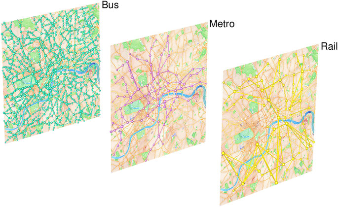 最近,网络研究为我们分析空间的、时间的、多层的网络提供了新的方法。公共交通网络是代表所有这三类网络的一个典型例子(如图1),通过这些网络研究中的新方法我们可以得到对这个系统的新的理解。已有的研究中大部分仅仅考虑单一的运输模式,还有少量仅仅关注多模态方面,表征了弹性和适航性或者城市层面上运输网络的时间同步性(如图2所示)。