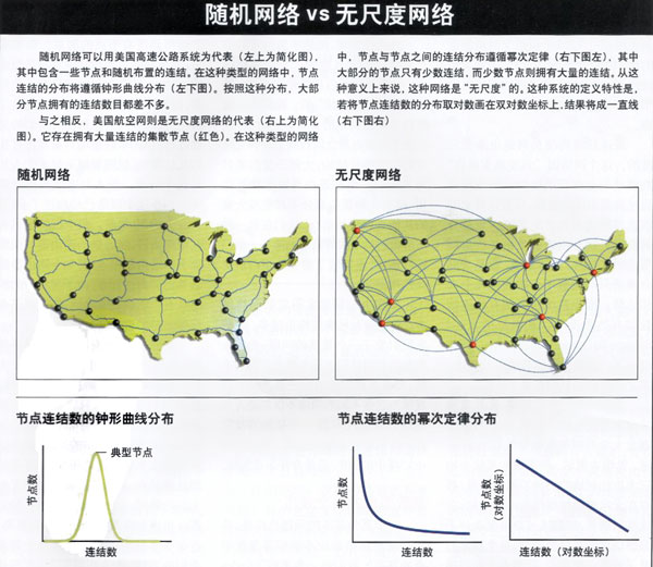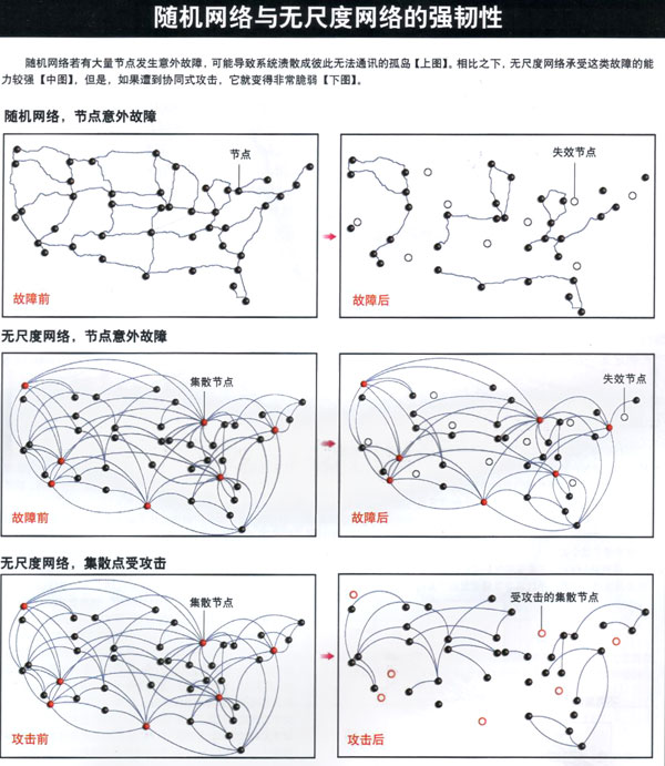 尽管网络是如此重要和普遍,但科学家对它的结构和属性却知之不多。在复杂的基因网络中,故障节点是如何相互作用而引发癌症的?在特定的社会和通信系统中,疾病和电脑病毒如何快速传播而导致流行?某些网络即便大部分节点失效,还能维持运行,原因何在?最近的研究开始找到这些问题的答案。过去的几年中,不同领域的研究者发现,很多网络都是由少数一些具有众多连结的节点所支配的,包括万维网、细胞代谢系统,以及好莱坞的演员网络在内。包含这种重要节点(或称集散节点)的网络,我们通常称之为"无尺度"(scale free)网络。在无尺度网络中,有些集散节点甚至具有数不清的连结,而且不存在代表性的节点。这种网络还具有可预期的行为特性:例如对意外故障具有惊人的承受力,但面对协同式攻击时则很脆弱。