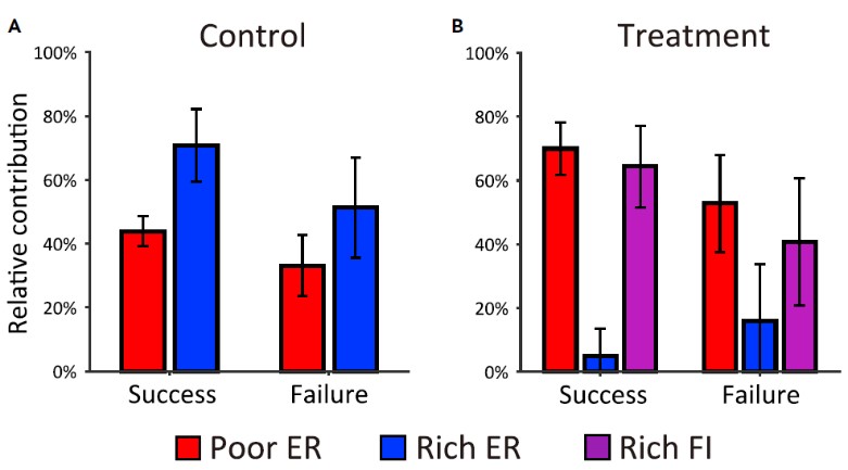 图3A:控制组成功和失败组的贡献。图3B:实验组成功和失败组的贡献和激励。