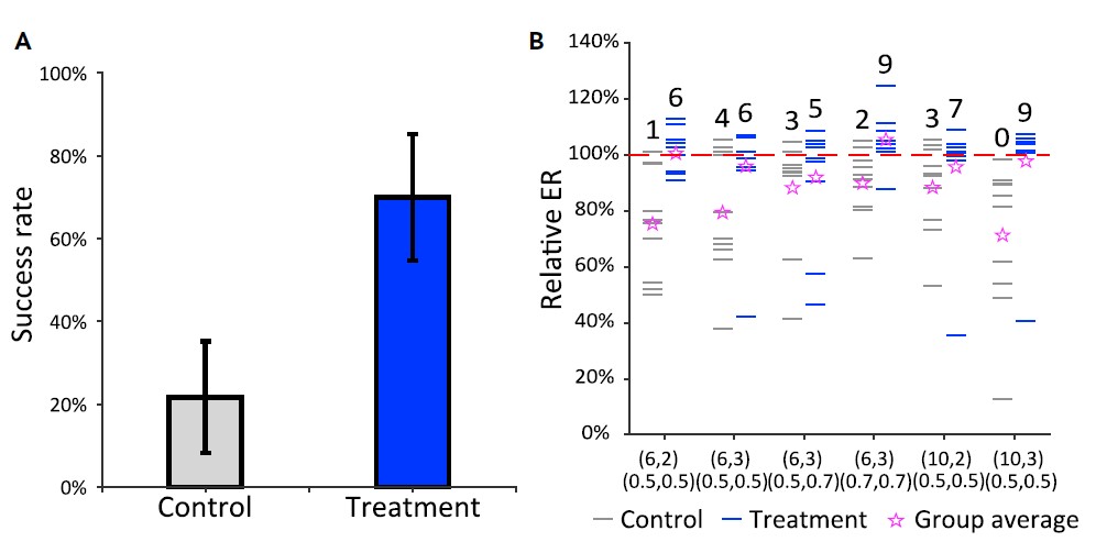 图2A:控制和实验组的减排达标率。图2B:不同参数下控制和实验组的减排量。