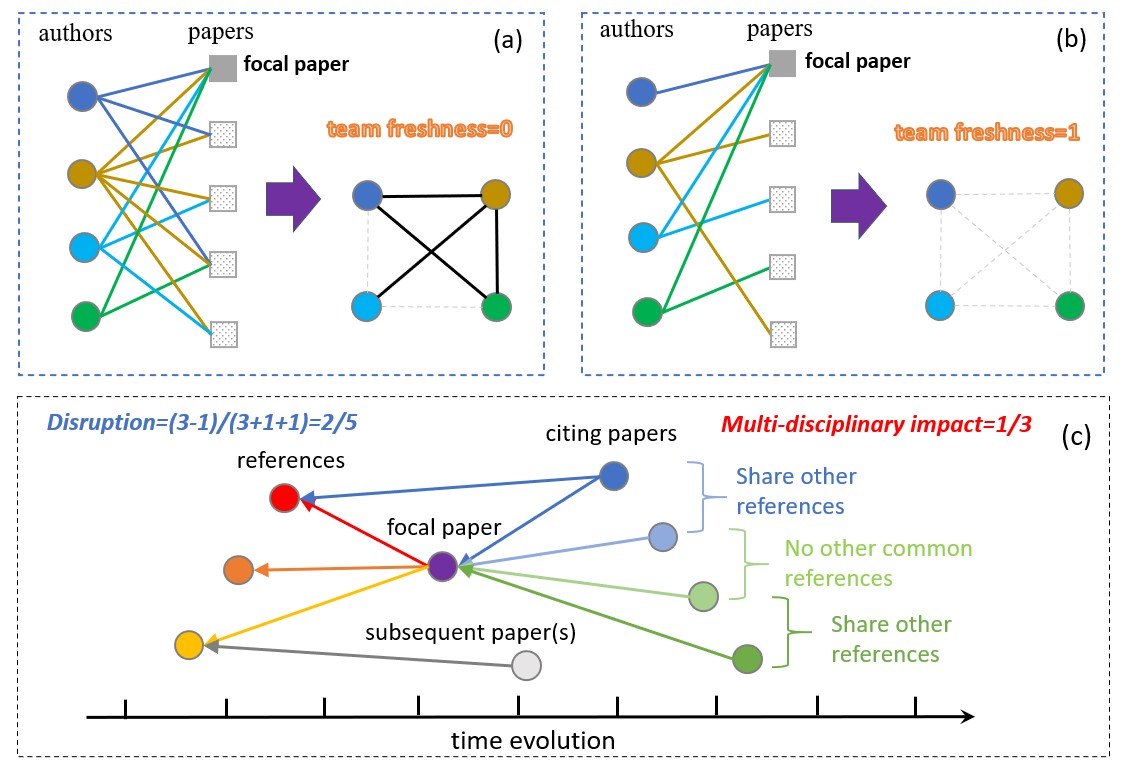 图1,(a-b)新旧团队的定量化计算方法以及(c)论文原创性和学科交叉性的量化方法展示。其中团队的新旧程度由团队成员的历史合作网络来量化。论文的原创性由其施引文献对其参考文献的引用比例来量化,学科交叉性由其施引文献间的相似程度来量化。