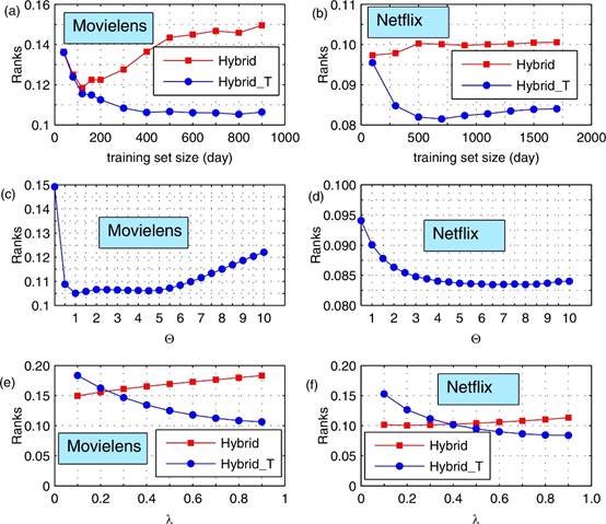Fig. 7. (Color online) (a)(b) show the dependence of ranking score on the training set size when traditional Hybrid method and the timeliness-based Hybrid method are used in Movielens and Netflix, respectively. In these two figures, the parameter θ and λ are respectively set as 1 and the optimal value for ranking score. (c)(d) show the effect of θ on the ranking score in Movielens and Neflix. In these two figures, the parameter λ is set as the optimal value for ranking score. (e)(f) show the dependence of the ranking score on parameter λ in Movielens and Neflix. In these two figures, the parameter θ is set to be 1.