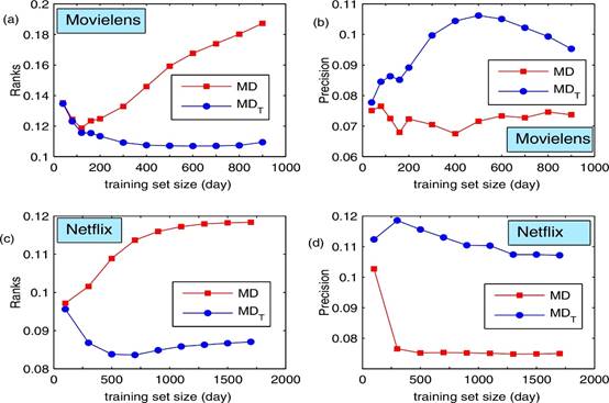 Fig. 6. (Color online) The dependence of ranking score and precision on the training set size when the traditional and timeliness-based methods are applied. The size of the training set is measured by the number of days’ data in the training set. The probe set consists of 10% (this ratio is with respect to the total number of links in the data set) future links after the testing time. (a)(b) are the results of the Movielens data set. (c)(d) are the results of the Netflix data set.