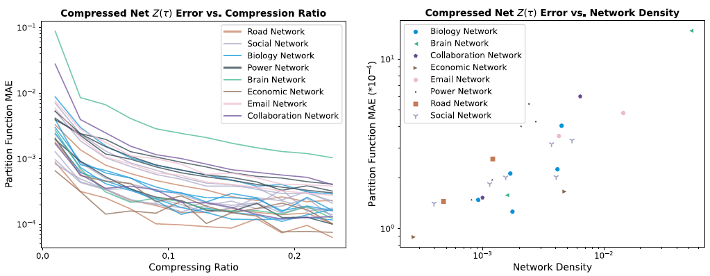 首先,可以发现模型的表现并不会随着数据所属领域而呈现出不同,但的确存在着网络的结构属性将会对模型的粗粒化后保留配分函数的精确度造成显著影响,那就是原始网络的密度,如图5右图所示:原始网络密度和压缩后的配分函数误差近似呈现幂律关系。这或许是因为更高的密度意味着更高的信息传递方式的多样性,从而使粗粒化难度增大。