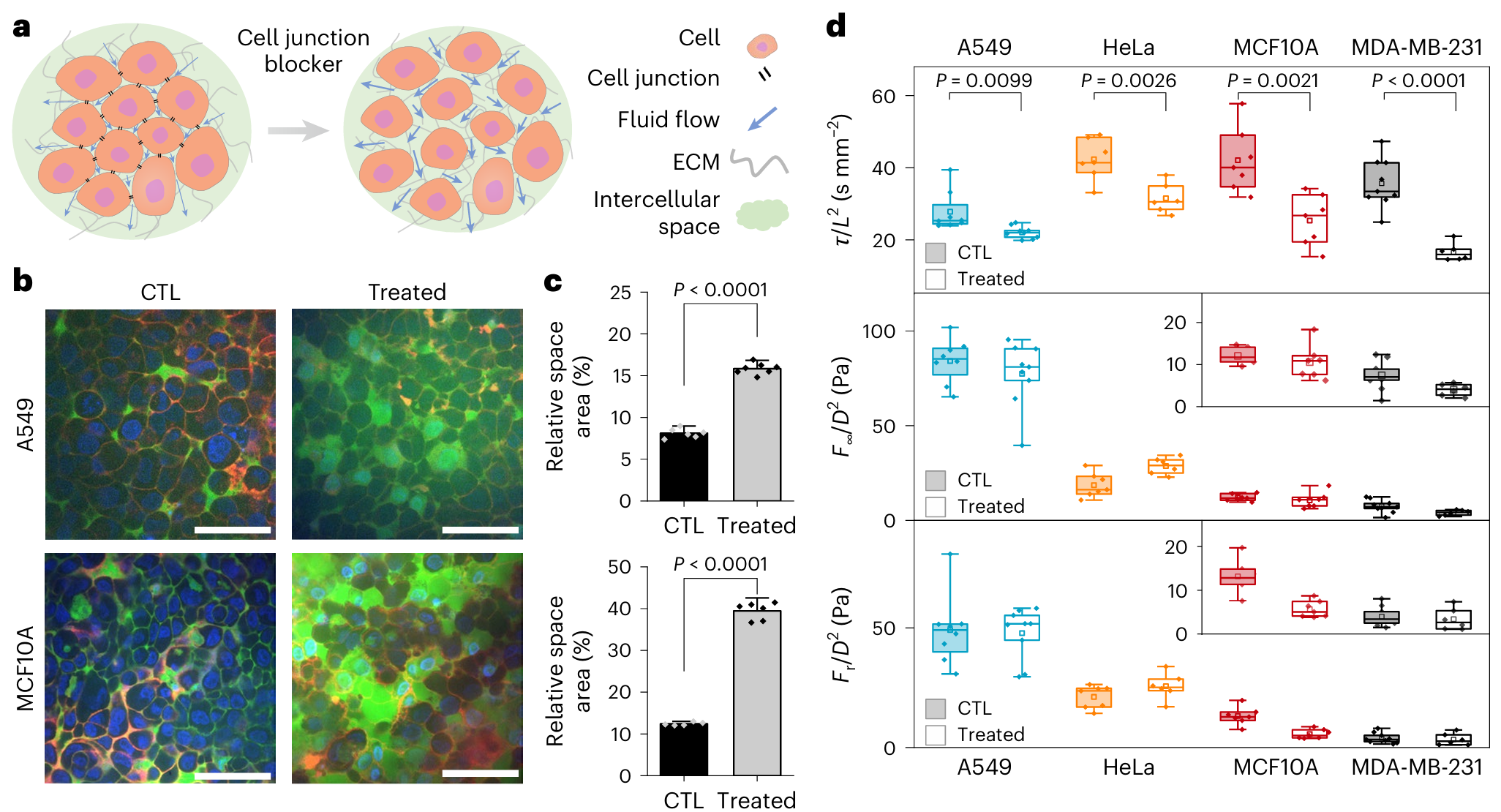 为了进一步验证间质流体输运是这一现象的核心机制,研究团队通过药物抑制细胞间隙连接(gap junction),人为增大了细胞间隙。结果显示,细胞间隙的增大使得组织内部的流体更易于流动和重新分布,从而显著加快了力学松弛的速度。这一结果直接证明了细胞间流体输运是主导组织多孔弹性的关键物理机制。
