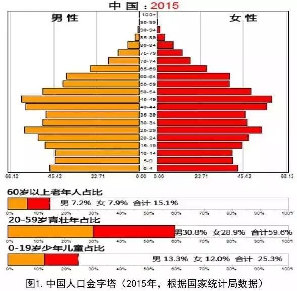 关于年龄分布结构,比较全面的定量计量方法是“人口金字塔”。从图1可以看出我国的人口年龄结构已经进入收缩型结构。特别地,如果我们关注劳动力人口(这里指15~59岁人口),我国从2012年就开始绝对减少:2012减少345万,2013年减少244万,2014年减少371万,2015年减少487万,2016减少349万,5年已经累计减少1796万,接近占世界人口第61位的智利总人口。苏剑教授更预计2022年以后劳动力人口减少呈加速态势,每年超过1000多万。再看一个社会更活跃人口,或者叫活性人口,比如15~45岁人口,虽然很遗憾我手头没有这几年的统计数据,我猜想这些年也应该是绝对减少的,而这对经济社会的影响应该更显著。