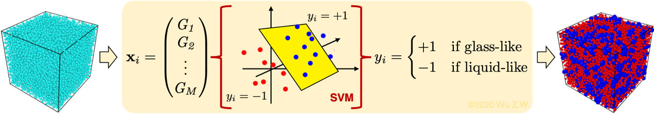 在液体的结构—动力学关系研究中,局域密堆结构(obtained via Voronoi tessellation analysis)或键角序(bond-orientational analysis)的使用非常频繁,这些物理量一般内涵有系统重要的原子结构信息,据此建立的一系列结构—动力学关系对理解液体动力学转变行为起到积极重要的作用。但与上述研究思路不同的是,在最近的一项工作中,通过监督计算机学习大量玻璃态样品的原子结构,我们得到了一个可以识别类固原子结构(glass-like)的训练模型,这个通过SVM方法构建的高维参数模型,可帮助我们在不依赖于经验参数的前提下,考察金属玻璃形成液体中SE关系失效所对应的原子结构特征。