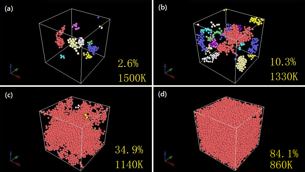 FIG. 3: Glass-like atoms and their connected clusters during the cooling process, classified by the SVM training model.
