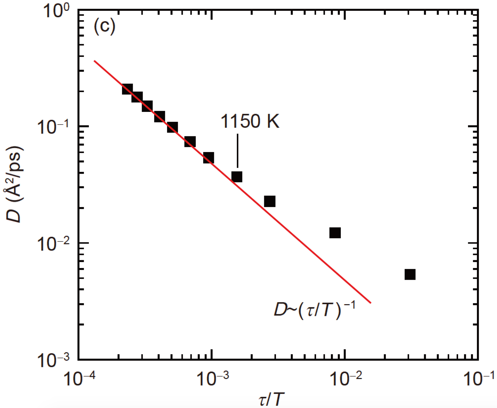FIG. 1: Self-diffusion coefficientD as a function of structural relaxation timetau scaled by temperatureT. The system follows the Stokes-Einstein (SE) relation till to 1150 K and violates the SE relation below 1150 K.
