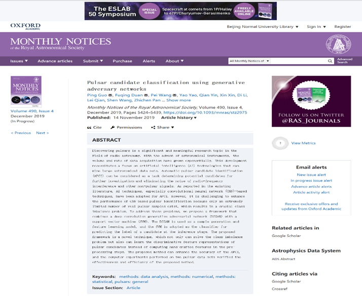 日韩av图形图像与模式识别实验室(IGPR)郭平教授课题组在人工智能与天文学交叉研究领域取得进展。近日,该成果以“Pulsar candidate classification using generative adversary networks”为题,在天文技术与方法领域TOP期刊《Monthly Notices of the Royal Astronomical Society》在线发表。