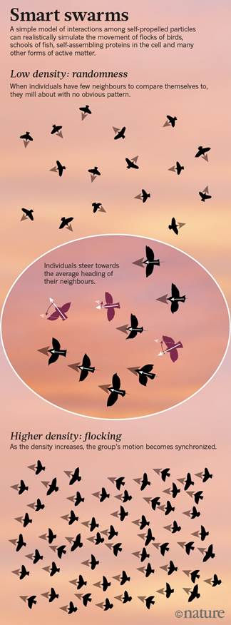 作者指出从鸟群到蜂拥的分子,物理学家们试图了解“活性物”,寻找一个生活世界的基本理论(From flocking birds to swarming molecules, physicists are seeking to understand 'active matter' — and looking for a fundamental theory of the living world.)。