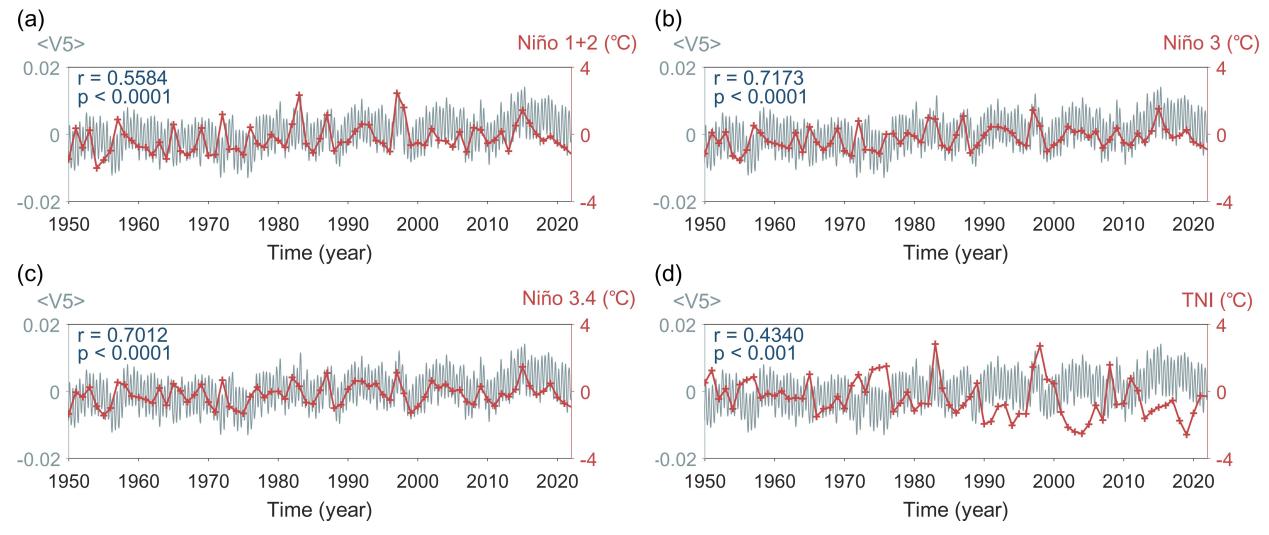 图2: 1950 ~ 2022年EM5 时间模态 V5与4个El Niño指数年平均值的关联分析。图2(a)和2(b)分别描述了V5的年平均值与Niño3和Niño3.4指数之间的相关性,而图2(c)和2(d)显示了V5与Niño1+2和Trans-Niño指数(TNI)的关系。与Niño3和Niño3.4观测到的强相关系数表明,EM5有效捕获了El Niño事件特征的中太平洋和东太平洋海温异常。与Niño1+2和TNI的适度相关性进一步支持了V5在表示El Niño变异性的各个方面的稳健性。这些结果强调了EM5通过与El Niño现象的关联在调节全球表面温度模式方面的重要作用,为这些周期性事件的气候影响提供了有价值的见解。