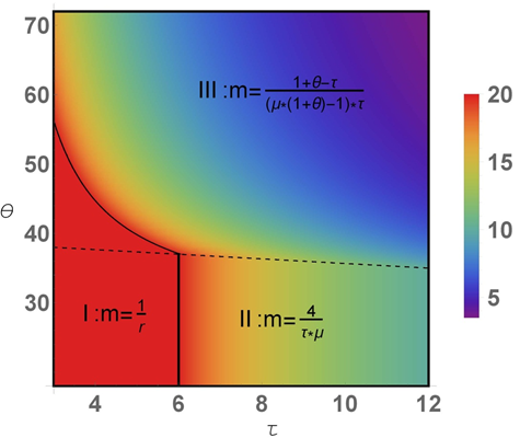 通过对比不同情形下乘数的变动,发现在经济不景气时流动性监管会趋向于更加严厉这会导致货币乘数下降,从而引发信贷创造的顺周期现象。如图1所示实线与虚线所分割出的各个区域代表不同有效银行监管约束和不同经济场景,我们沿着纵坐标方向分析,实际还款期限增加可以看作负债人偿还能力下降、还款流减小、银行系统总合还款流减小,一般来说这意味着经济增长减缓甚至出现衰退。然而我们看到与此同时监管状态从底部第一区域或者第二区域向第三区域移动也就是向相对较小的乘数和总信贷量的区域移动,这就形成了完整的顺周期链条。