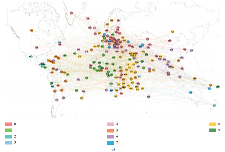 为了更准确地对国家间的贸易关系和各国的贸易环境进行量化描述,文章将每一对贸易关系隶属第一类(主要受自然因素影响)的概率加总并进行归一化处理,从而定义了贸易纯粹指数(TPI,Trade Purity Indicator)。该指数描述了真实的全球贸易环境和国家之间的贸易亲疏关系,并可以用来量化分析区域贸易协议对局域和全球贸易环境的作用。图3中的圆点代表六个典型的区域贸易协议:“一带一路”倡议(BRI)、欧盟(EU)、加勒比自贸区(CARIFTA)、北美自贸区(NAFTA)、东盟(ASEAN)和非盟(OAU),并展示了这些贸易集团内部及外部平均贸易纯粹指数随时间的变化(总体趋势由箭头方向表示)。图中,不同颜色代表不同的区域贸易协定,圆点的大小随时间推移而增大。可以看出,大部分圆点都位于对角线下方,说明集团内部的贸易关系要普遍好于集团外部。其中,“一带一路”倡议、加勒比自贸区、东盟、非盟等协议的贸易纯粹指数主要向左下方变化,表明其内部和外部的贸易关系均有一定程度的疏离;而欧盟和北美自贸区的贸易纯粹指数主要垂直向上变化,表明其成员国与集团外部的贸易关系变得更加友好。这表明,尽管全球和大多数区域贸易关系在2007-2017年期间均有疏离的趋势,但区域贸易协定仍改进了部分区域的贸易关系,特别是促进了欧盟和北美自贸区主要成员国的相对繁荣。
