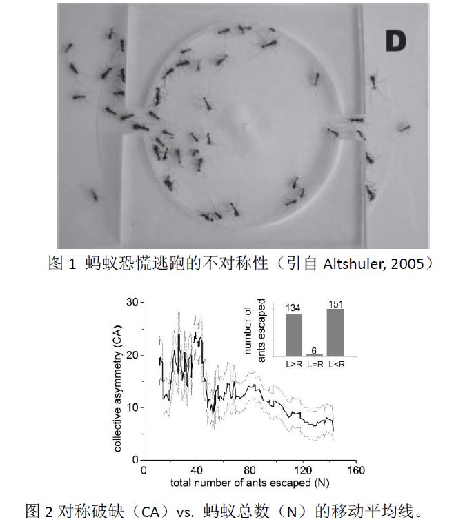 问题背景:有实验研究(Altshuler, 2005)表明,一群蚂蚁的逃跑行为并不是完全随机的:一群蚂蚁从一个有着两个对称出口的“房间”中逃出时,使用其中一个出口逃出的蚂蚁数目要比另一个出口多(图1):这样就产生了对称性的破缺。(Helbing等早在2000年针对人群,而非蚁群,在理论上模拟了这种现象。)这是一种有趣的集群运动的宏观现象。该研究进一步研究了密度如何影响不对称性。首先是理论结果:他们借用了认可度比较高的Vicsek model(该模型的核心机制是:每一个个体的运动方向将采用上一时刻一定范围内邻居的平均方向,也就是所谓的“对齐规则”)。模型结果表明对称破缺将随总数的增加而增加。然后是实验结果:他们的实验样本较小,误差较大,因此没有给出显著的结果。