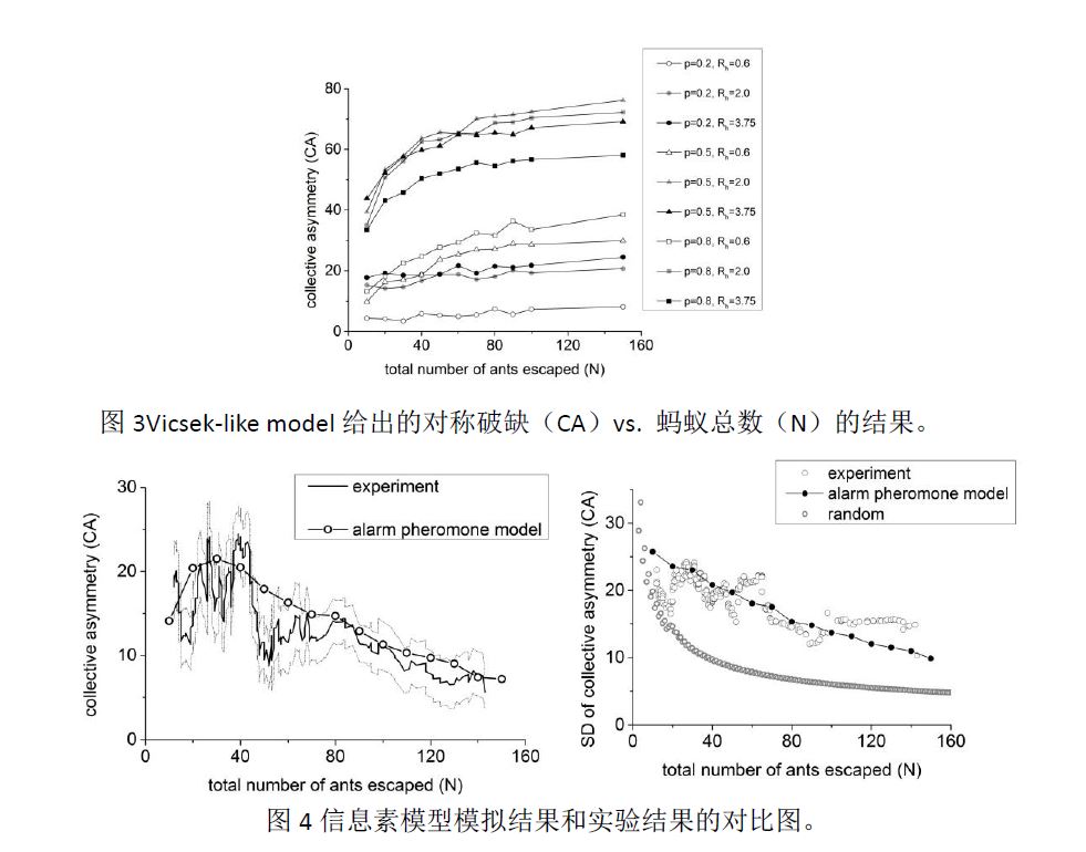 问题2的提出:实验结果和Vicsek model的模拟结果在定性上完全不符。因此有理由认为对齐规则并不是产生蚁群逃跑对称破缺现象的原因。那么,什么样的个体行为机制能够产生我们的实验结果呢?到底是怎么样的个体行为机制演绎出了群体的对称破缺呢?