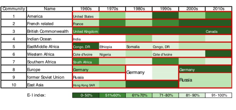 将全球人口迁移网络进行社团划分,可以得到以美国、加拿大、俄罗斯、法国、德国、印度、南非等,这些国家为中心的10个社团(图3)。50年来,各个社团的构成相对稳定,但也存在一些变化。并且,在EI系数、Gini系数和模块度等指标的计算中,人口迁移的全球化趋势也得到验证。例如,在图4中,2010s的社团普遍有相对更低的EI系数,表示社团之间的联系正在增多。同时,利用杰卡德系数分析各个社团自相似性,能够按阶段展现其变化,并展示重要历史事件对区域乃至全球人口迁移结构的影响。例如,前苏联的解体阶段性改变了欧洲的人口迁移模式、法国与部分非洲国家愈加亲密、环印度洋国家群的逐渐扩大、而中国香港逐渐失去了区域人口迁移中心的地位等等。