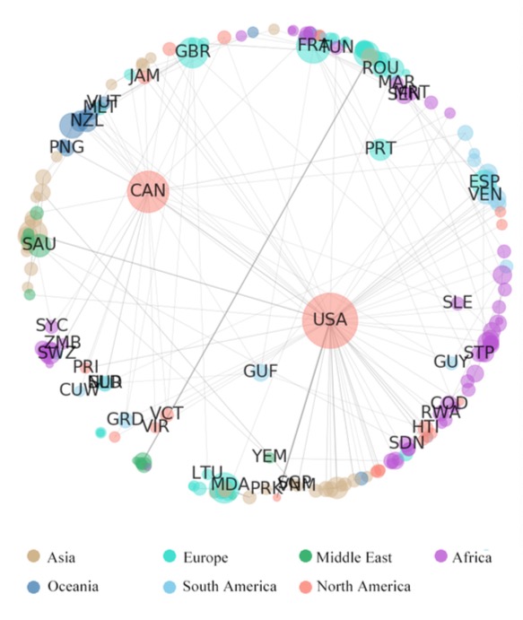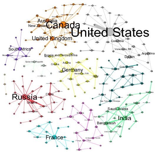 图3 全球人口迁移网络的社团结构