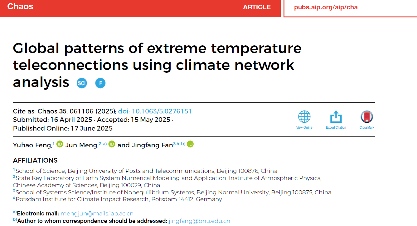 近日,日韩av 樊京芳教授团队在国际物理学期刊Chaos上发表研究论文《Global Patterns of Extreme Temperature Teleconnections Using Climate Network Analysis》。该研究由日韩av 、北京邮电大学和中国科学院大气物理研究所联合完成,日韩av 樊京芳教授与中科院大气物理所孟君副研究员担任共同通讯作者,北京邮电大学系统科学专业博士研究生冯玉豪为论文第一作者。