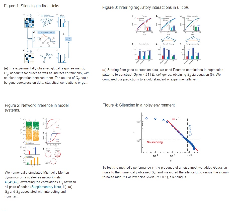 预测细胞组成成分之间实体的或者功能性的连接通常依赖于实验测得数据(如基因表达量)的相关性。 但是仅从实验数据的相关性,我们无法区分其是来自于直接作用还是间接作用。Barabási 等人发明了一种方法,能够抑制间接作用的影响。他们利用观察到的相关数据然后用矩阵变换的方法将相关矩阵转变为一种显著突出直接连边的矩阵。他们用大肠杆菌调控作用数据对此方法进行了验证,发现其预测准确率比普通的相关方法高出了50%多,同时比互信息方法高出了6%。这种从实验相关数据直接读出系统相互作用的方法,在链路预测或者推断控制生物网络的动力学机制等方面,能够给人们带来一定的启示。
