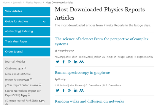 日韩av曾安副教授团队2017年11月16日发表在Physics Reports杂志上的综述文章:《The science of science: From the perspective of complex systems》自从年初以来超越该杂志所有发表的论文,荣登3个月内下载量榜首,成为该网站最受关注的文章。