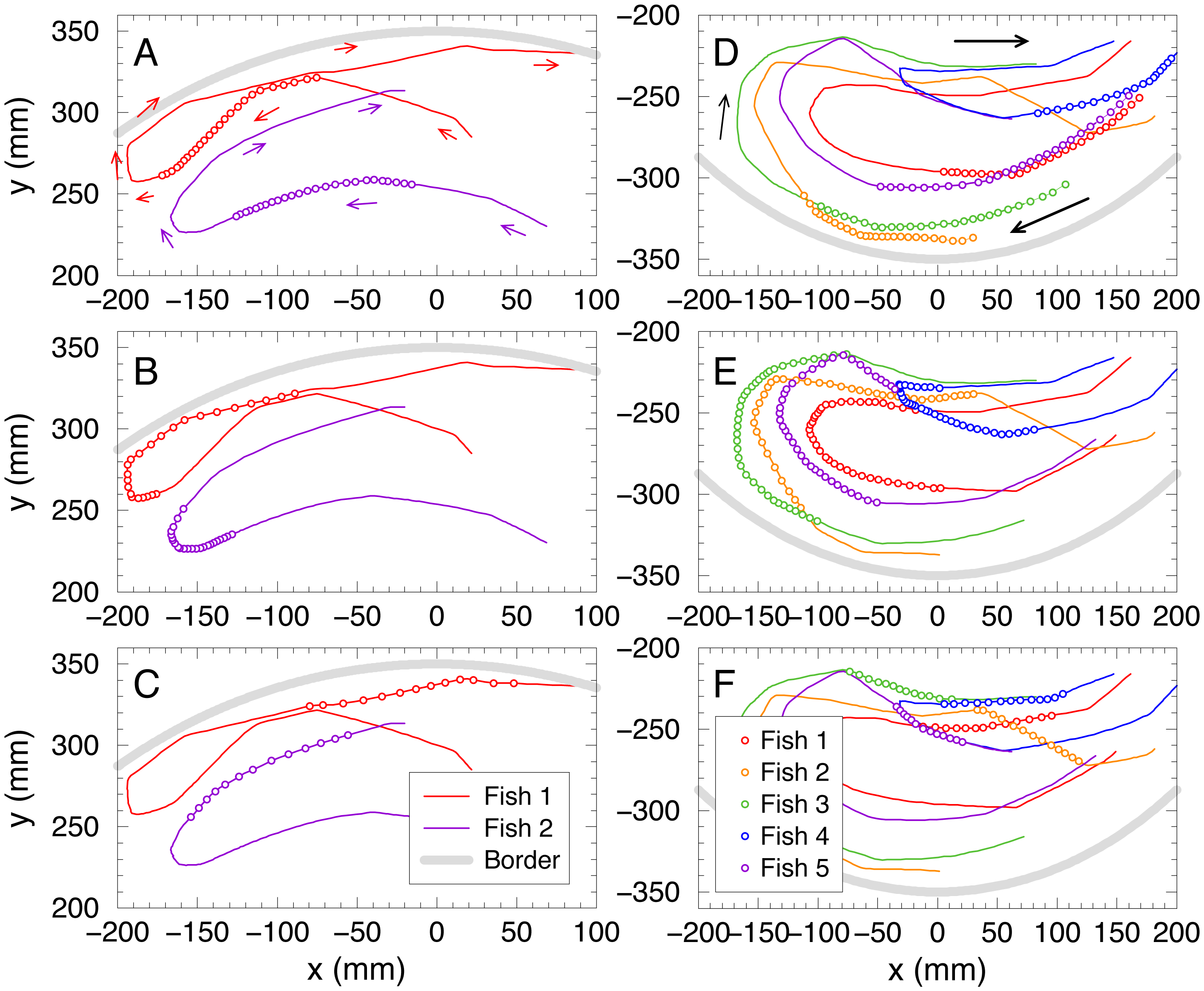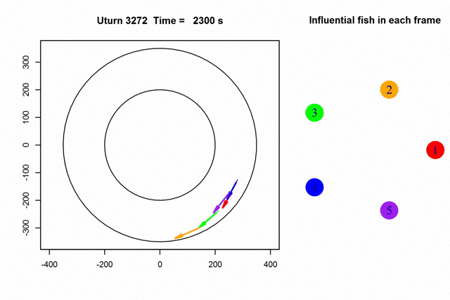 Figure 2. Reconstruction des interactions entre poissons au sein d’un groupe de 5 poissons lors d’un demi-tour collectif. (A) Trajectoires individuelles durant le demi-tour. Les flèches indiquent la direction de déplacement du groupe (B) Visualisation de la dynamique des interactions entre les poissons au cours du même demi-tour. Les flèches dont la couleur est celle du poisson dont le déplacement est influencé, indiquent la direction de propagation de l’information: du poisson influent vers le poisson influencé.