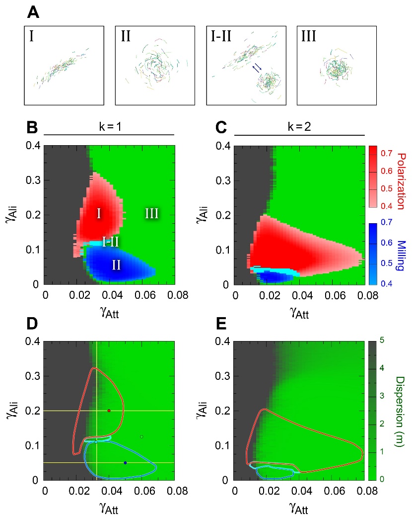 近期,日韩av 韩战钢教授团队博士生王伟嘉与法国图卢兹三大Guy Theraulaz教授合作,基于红鼻剪刀鱼(Hemigrammusrhodostomus)数据驱动模型对鱼类认知和环境感知能力与集群运动状态的联系进行了深入研究。该模型由红鼻剪刀鱼运动轨迹数据重构得到,完整描述了“加速—滑行”(burst-and-coast)运动模式下个体间的社会性相互作用以及多源信息整合方式。在此基础上,该研究系统分析了相互作用策略、相互作用强度与范围、个体行为随机波动以及群体规模对鱼群协同运动能力的影响。研究发现,当群体在吸引作用下保持聚集时,1至2个最有影响力邻居的方向信息即可使群体实现协同运动;一致性游行与同向环绕的形成则依赖于方向对齐作用。其次,相互作用强度与范围对集群运动状态的影响等价,其持续增加并不意味着聚集程度与协同能力的提高,过强的相互作用将使群体进入蜂拥状态。此时社会性相互作用与行为随机波动的作用相同。最后,群体在不同规模下均可形成稳定的集群运动状态。