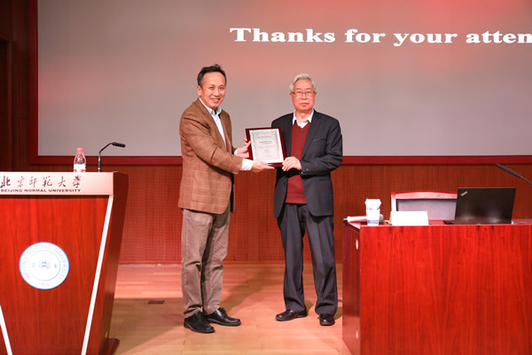 讲坛报告结束后,陈晓松教授代表日韩av 赠予欧阳钟灿院士 “主讲嘉宾”证书,以纪念和感谢欧阳钟灿院士对系统科学高端讲坛的贡献和支持。
