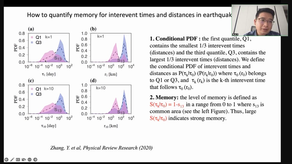张永文,特聘副教授,硕士生导师。现就职于昆明理工大学理学院数据科学研究中心,2017年毕业于中国科学院理论物理研究所,统计物理方向,获理学博士学位。2018-2020年在以色列巴依兰大学物理学院从事博士后研究工作, 并参与欧洲2020RISE地震研究和预报项目。主要研究方向在复杂系统和地球系统科学领域,涉及地震、空气污染和极端降雨等极端灾害问题的研究。近年来在相关领域发表论文20余篇,以第一作者在Geophysical Research Letters、Journal of Geophysical Research: Solid Earth、Physical Review Research、New Journal of Physics、Europhysics Letters等期刊上发表过学术论文。2021年获云南省青年拔尖人才。