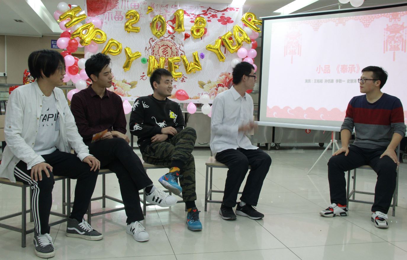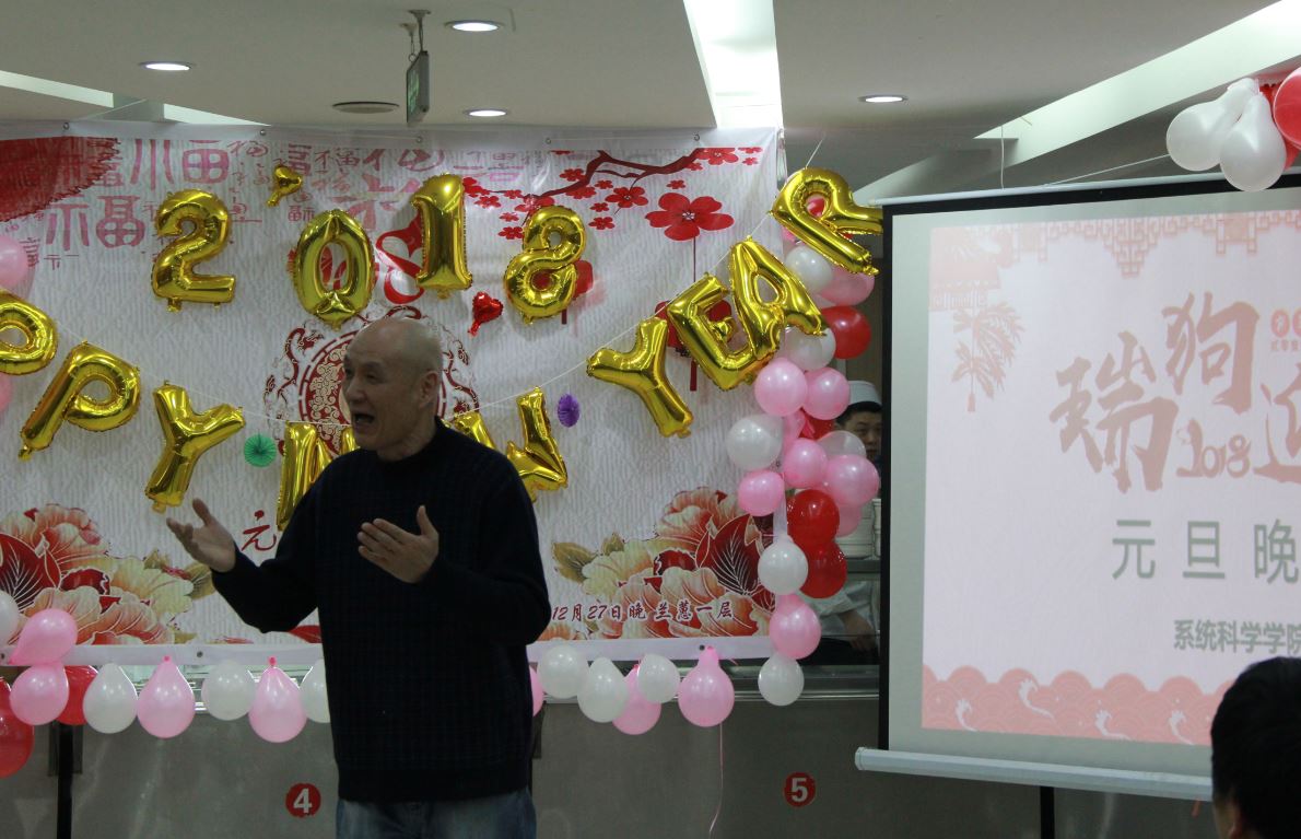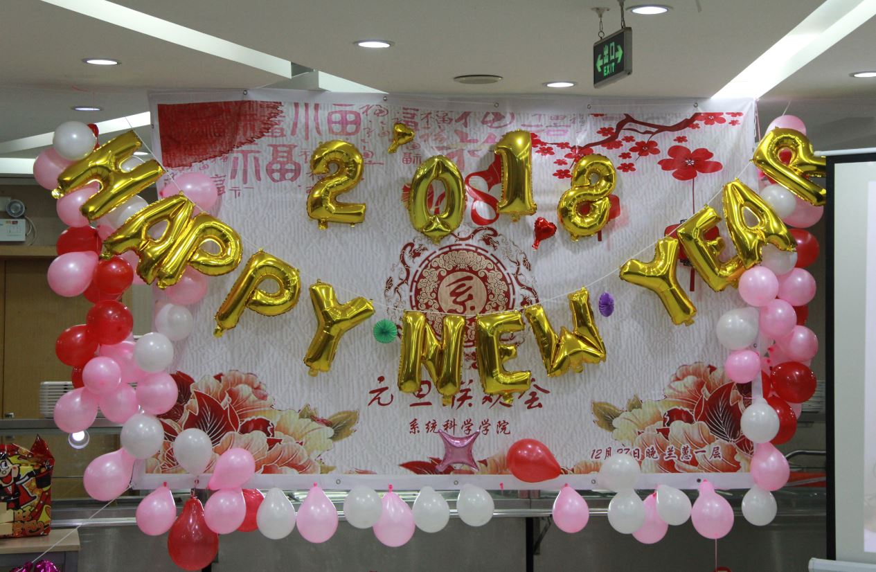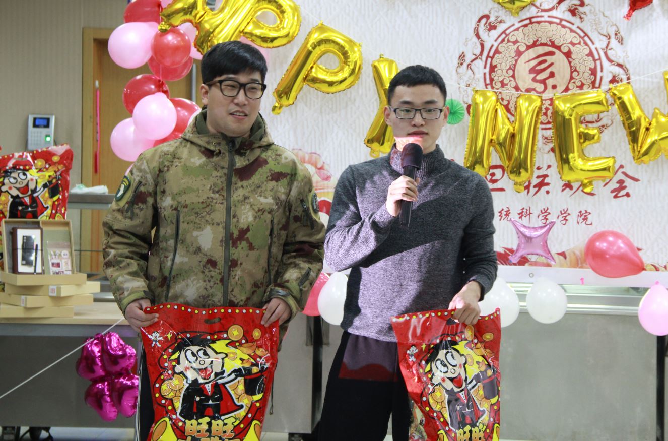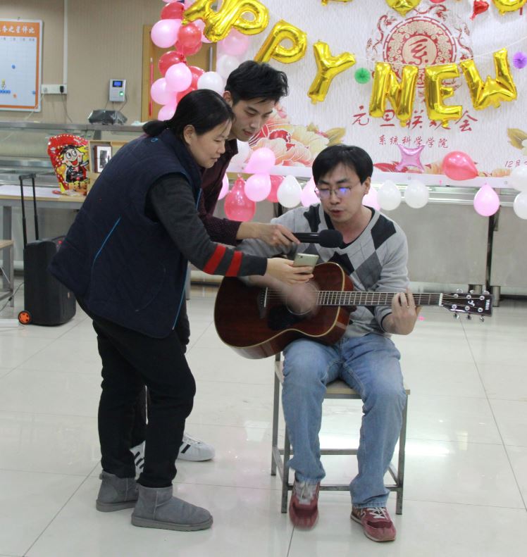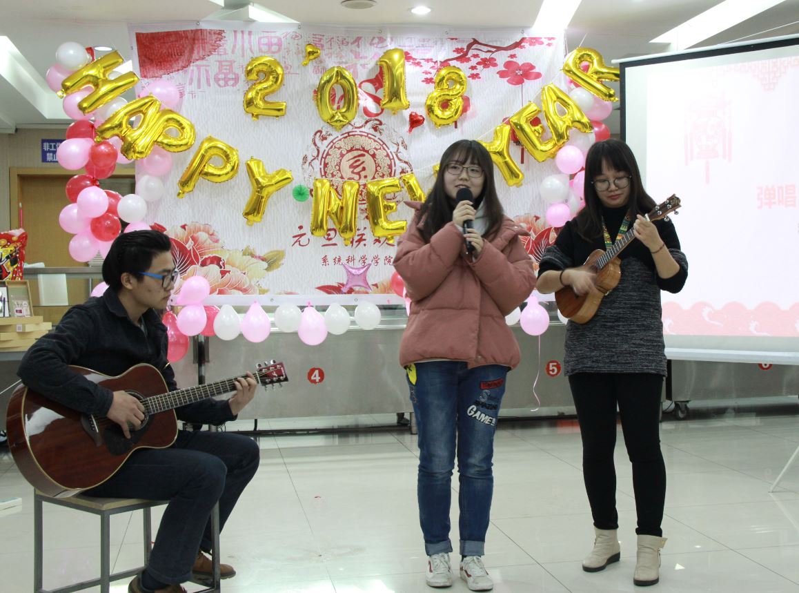 在狄老师的新年贺词后,晚会节目开始上演。王鹏皓和武晓忠献上动听的歌曲《海芋恋》;文雷的脱口秀节目《我们》赢得现场观众的阵阵掌声;陈清华老师的女儿朵朵进行了电子琴演奏。在三个节目后,开始了本场联欢会的第一个游戏环节——铁人四项,四个小组分别派出老师同学参加一口气喝可乐、筷子夹弹珠、朗诵诗歌吹蜡烛、公主抱深蹲等环节,全场欢笑不断,刘奥强抱郑老师深蹲更是成为本次游戏的亮点。接下来的抽奖环节迎来了晚会的第一个小高潮,主持人宣布三等奖的祝福语,大家通过扫入场贺卡上贴着二维码,查看自己是否中奖。在游戏和抽奖后,节目继续,高雨薇、赵茜、高飞带来吉他弹唱《小手拉大手》;王铭崧、孙铠嘉、李敬一、史惠泽、王程锦、高林表演的小品《奉承》更是掀起了整场联欢会的高潮,也让我们看到研一同学演技和创造力,为学院注入了新的活力;张江老师的女儿张玲祎演唱了《Let it Go》,天真稚嫩的童声格外可爱。接下来主持人公布了二等奖的祝福语,伴着第二次的抽奖,开始本场的第二个游戏环节《系统科学之猜猜猜》,学院师生同心协力做游戏,猜着与学校生活、系统科学专业相关的各种词语,场面热闹欢快,欢声笑语不绝于耳。下面的节目是全体研一新生带来的舞蹈《PANAMA》;研三的李志成、刘奥强、龚力、马玉财合唱了一首《啊,朋友再见》。歌曲之后,进行了第二轮《系统科学之猜猜猜》,并公布了一等奖的祝福语,联欢会进入尾声。最后,袁强老师声情并茂地演唱了《北方吹》、《南泥湾》等歌曲,为元旦联欢会画上圆满句号。