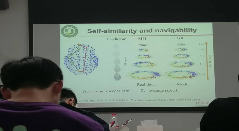 2023年4月21日下午15:00,江苏大学的郑木华教授在科技楼B604会议室做了题目为“self-similar transformation of complex network and is applications”的报告。郑木华教授分享了一个框架来研究不同分辨率的复杂网络中的对称性问题,以及证明了GR模型在按比例缩小的网络中产生了网络的多尺度展开,可用于预测人类连接体的多尺度自相似特性。同时提出了几何分支生长(GBG)模型的逆重整化变换,用于预测真实网络演化中的自相似分支生长,并解释观察到的对称性。讲座由日韩av 樊京芳老师主持,现场有日韩av 近20位师生参与了讨论。