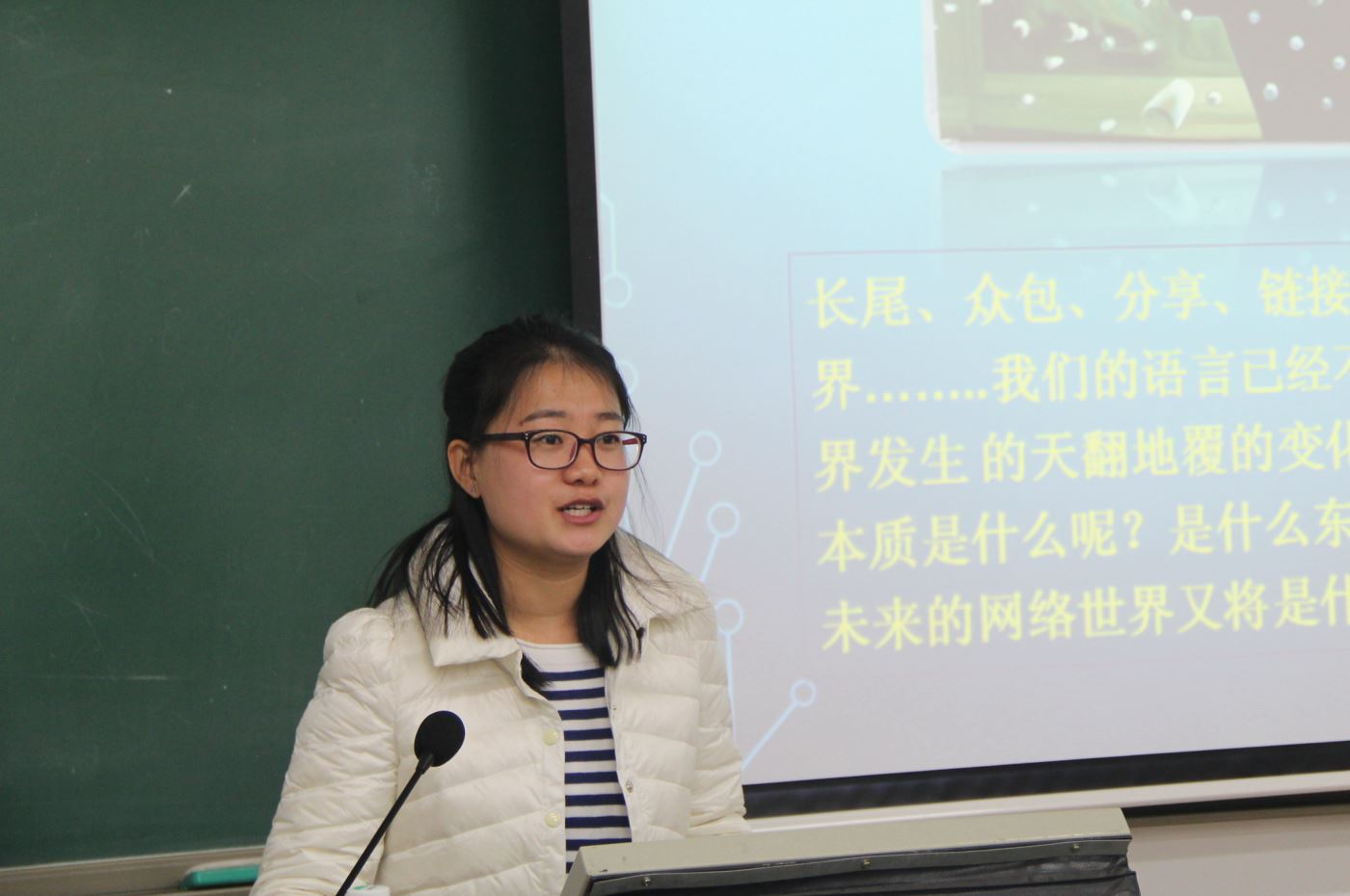 张老师讲到,注意力即是互联网的动力引擎,并介绍了注意力科学的发展史,以及注意力经济、注意力管理、意向经济、集体注意力等领域的代表人物和主要观点。张老师还唱起了歌曲《味道》,并以里面的歌词“想念你的笑,想念你的外套,想念你白色袜子”为例说明了人与人的交流其实是相互之间注意力的交换。
