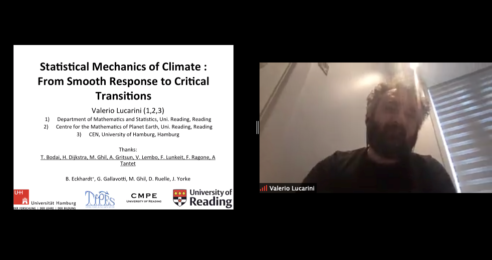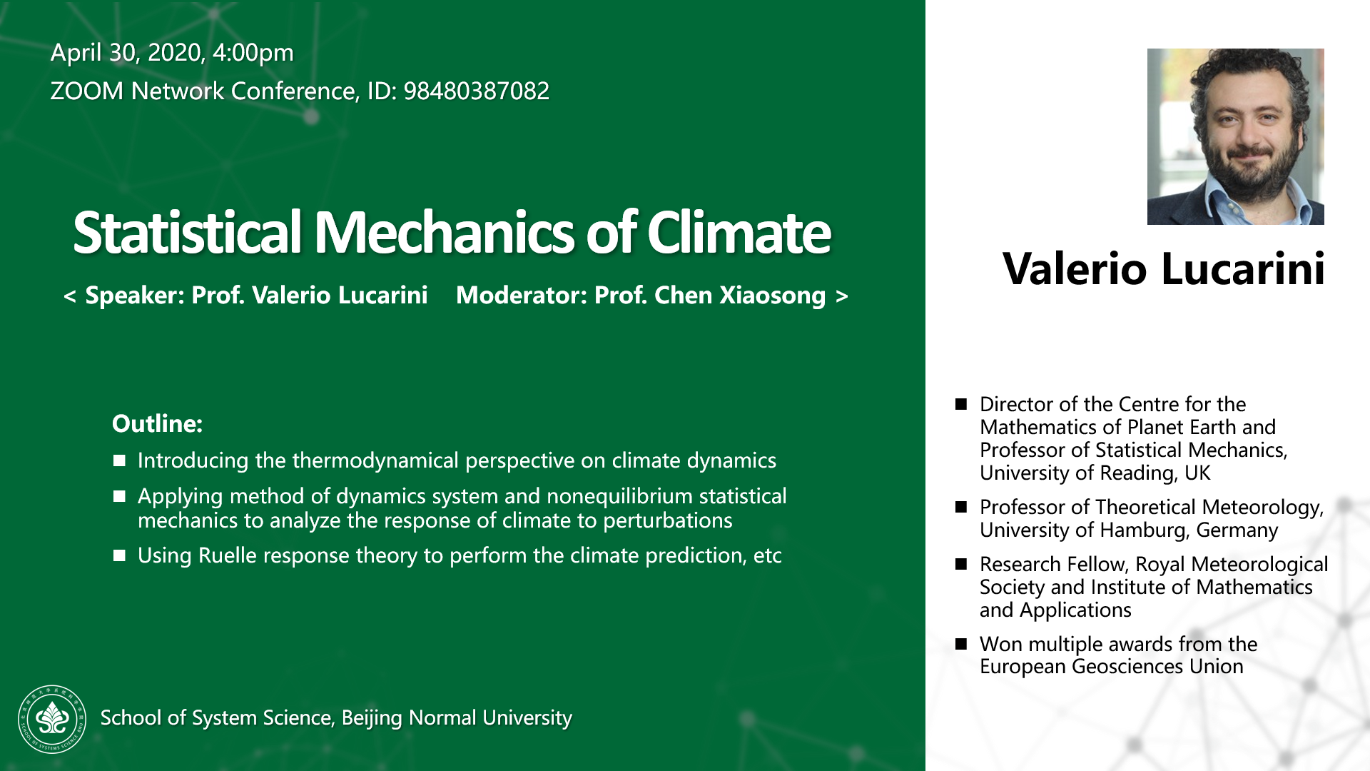 2020年4月30日下午,日韩av 邀请英国雷丁大学Valerio Lucarini教授为全院师生进行了主题为“Statistical Mechanics of Climate”的线上讲座。讲座由日韩av 院长陈晓松教授主持,全院师生及来自学校物理系、地理学院和中国气象局、中科院气候所、美国夏威夷大学、集智俱乐部的专家学者和学生,逾130人参加了会议。并由集智俱乐部在bilibili网站上进行了同步直播(//live.bilibili.com/8091531),在线观看人数达到1111余人,观众反响热烈。