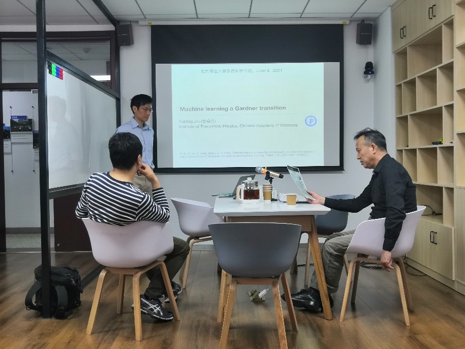 金老师展示了硬球玻璃的三维模拟结果与加德纳相变(连续非平衡相变)的最新理论预测是一致的。利用混合分子模拟-机器学习方法,研究得到了有限尺寸效应的标度律,并确定了传统方法估计的临界指数。此外,金老师课题组讨论了将此方法应用于类一阶跃迁(即硬球玻璃的熔化)和自旋玻璃跃迁的可能性。讲座期间,到场的老师同学与金老师就研究问题进行了热烈的讨论,对以系统科学的视角开展交叉学科研究做出展望,并提出了理论、实验与模拟相结合的研究路线的愿景,本次讲座圆满结束。