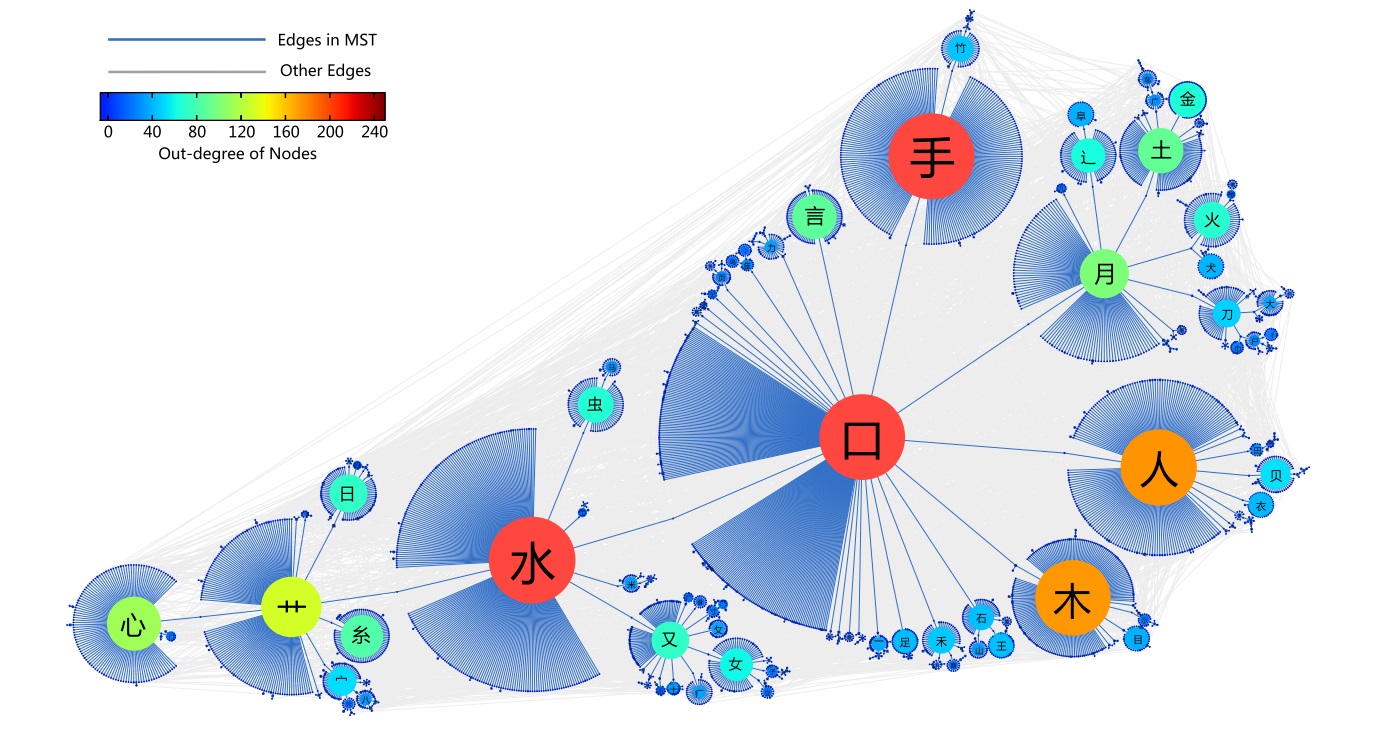 汉字之间在结构上是相互联系的,而且汉字的含义、读音是与汉字的结构相互联系的。例如汉字“墨”与“黑”不仅字形相互关联,含义相互关联,甚至有文化和工艺含义。但是,目前的汉字教学和检测方面,例如汉字学习的顺序,汉字检测的样本大小和检测的顺序等等问题,基本上是把汉字当成独立的个体处理的。系统科学认为系统组成要素之间的联系决定了要素的内涵以及系统的整体性质。因此,注意到这些关系之后,研究者们思考了如何让这样的关系服务于汉字研究和汉字教学。在这个初步的工作中,我们利用网络来描述汉字与汉字之间的关系,前者是网络的顶点,后者是边。顶点上可以有权重(大语料库中的使用频率),边上也可以有权重(构字方式与理据性程度)。然后大致来说,我们需要优先学习权大的顶点,底层的顶点,度(顶点的边的数目)大的顶点。在这个工作中,研究者们提炼出了一个数学公式来反映这三个方面的考虑,进而从理论上讨论了几种学习顺序的比较。
