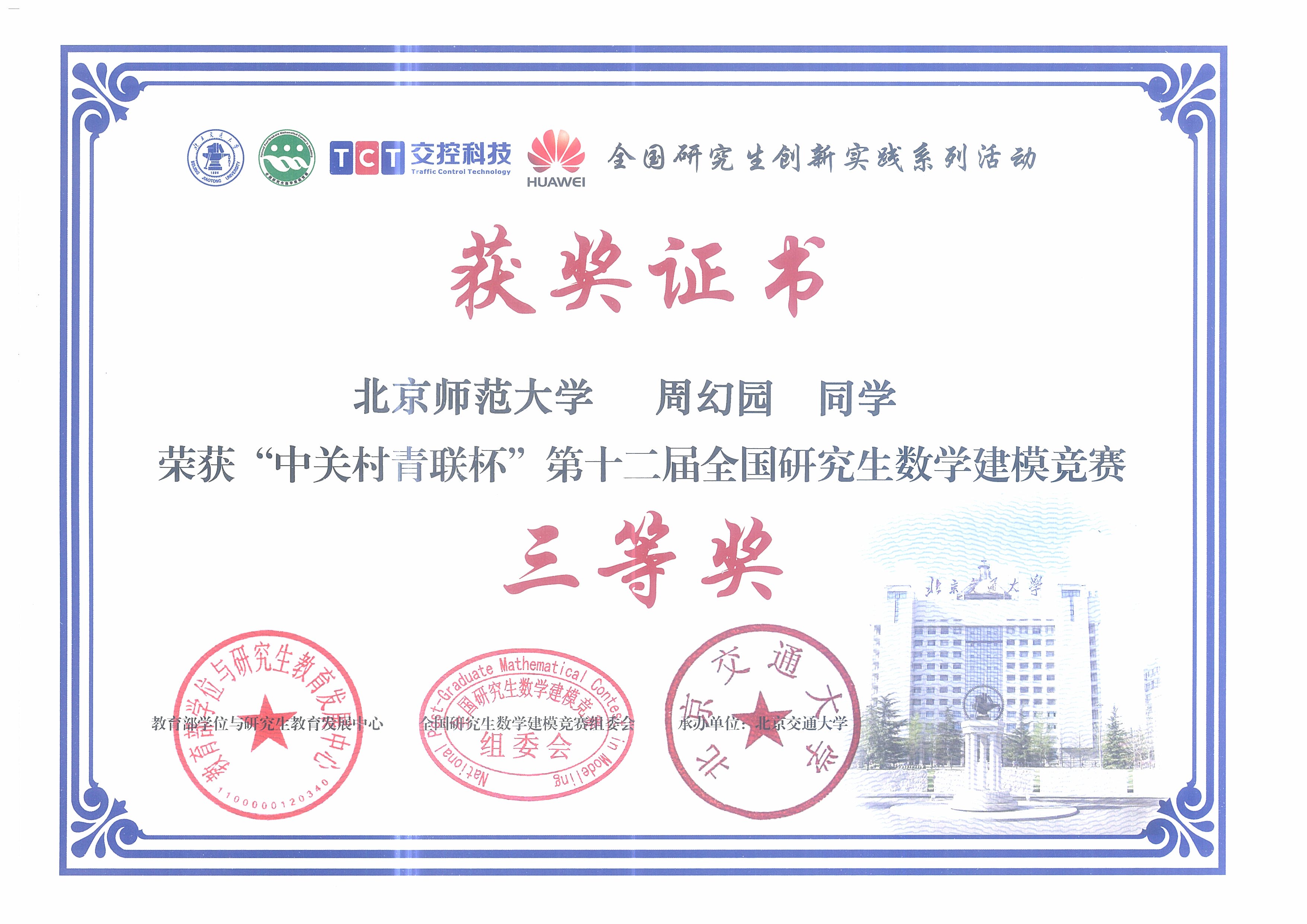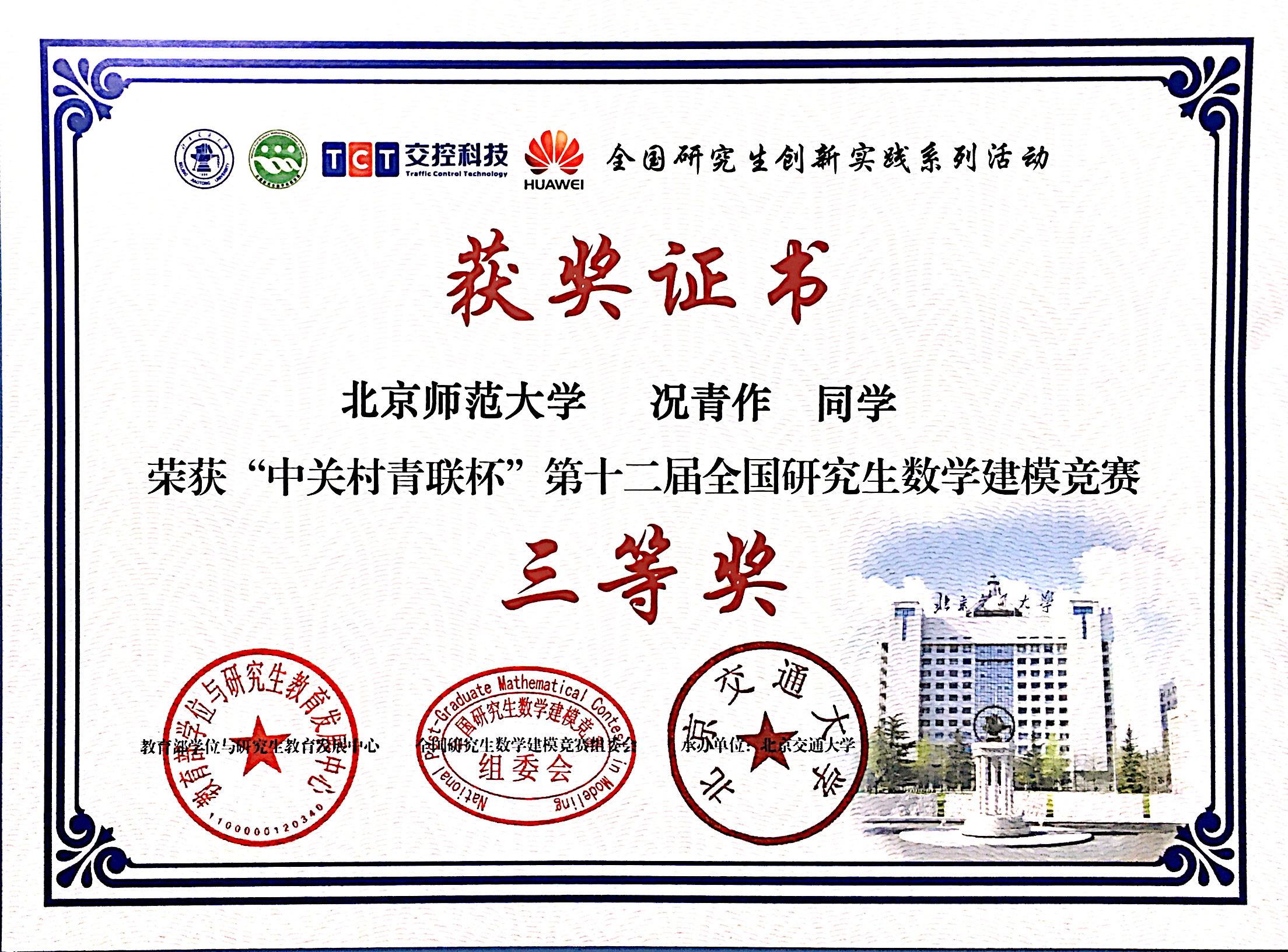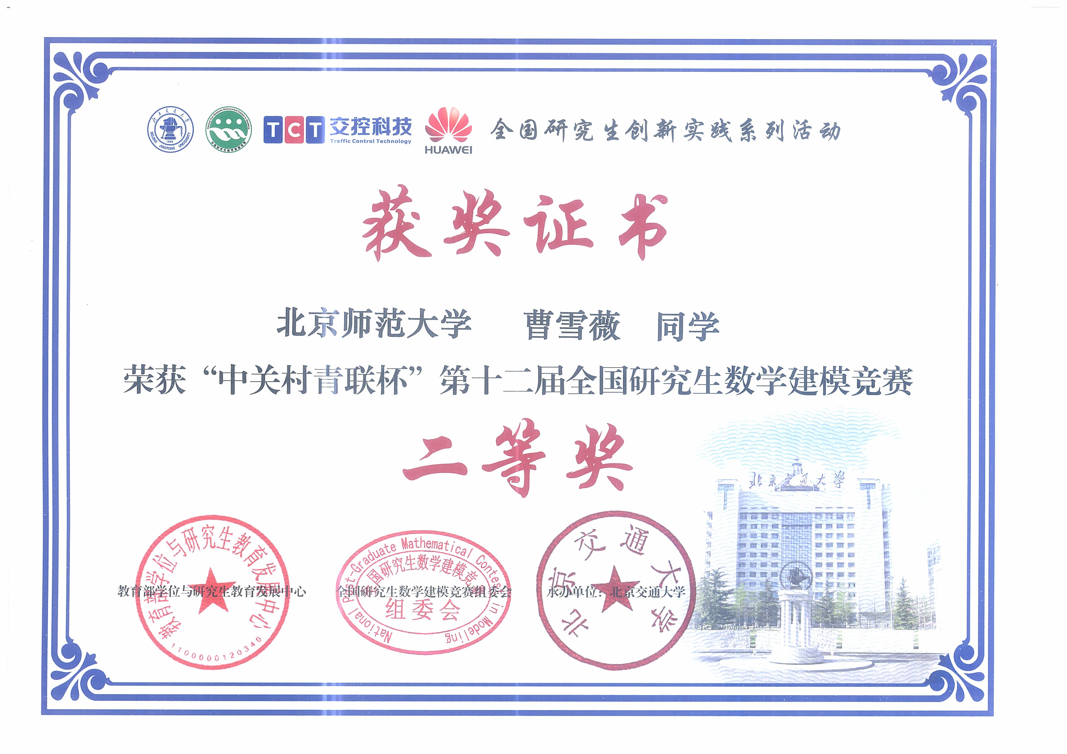 2015年12月,在“中关村青联杯”第十二届全国研究生数学建模竞赛中,日韩av 硕士研究生曹雪薇、马玉财荣获二等奖,况青作、张琪和周幻园荣获三等奖。