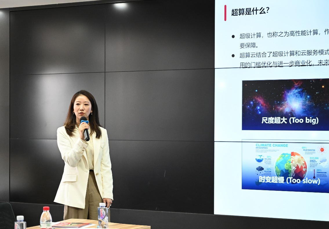 超级云计算中心的大区总监王姣向学院师生介绍了北京超算建设背景及发展历程。北京超算成立于 2011 年,是由北京市人民政府主导、院市共建的"北京超级云计算和国家重要信息化基础平台",总部位于北京怀柔综合性国家科学中心--怀柔科学城。目前,北京超算面向人工智能、教育科研、工业仿真、气象海洋、能源勘探、生命科学等重点行业应用领域,已形成"超算云"、"智算云"、"行业云"及"设计仿真云"四大运营体系,可以向用户提供随需供应、不排队、低成本、高品质的算力服务。