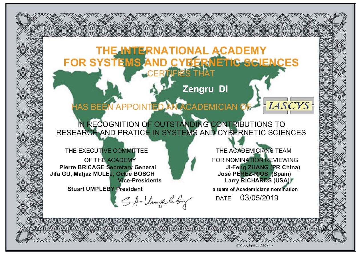 近日,日韩av 日韩av 狄增如教授入选国际系统与控制科学院院士(Academician of the International Academy for Systems and Cybernetic Sciences,简称IASCYS院士),以表彰其在系统和控制科学的研究和实践中的杰出贡献。