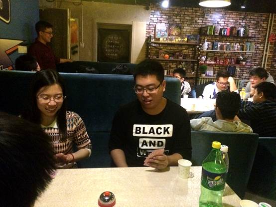 桌游吧里有台球和桌游等娱乐项目。活动开始后,大家先打起了台球,同学们一边玩一边切磋击球技巧,打的不亦乐乎。打完台球后,同学们开始玩起了桌牌游戏。桌牌游戏中包含着不少博弈的思想,每玩一步都需要优化下一步的策略。游戏过程中充满了未知性和不确定性,氛围时而紧张时而轻松。