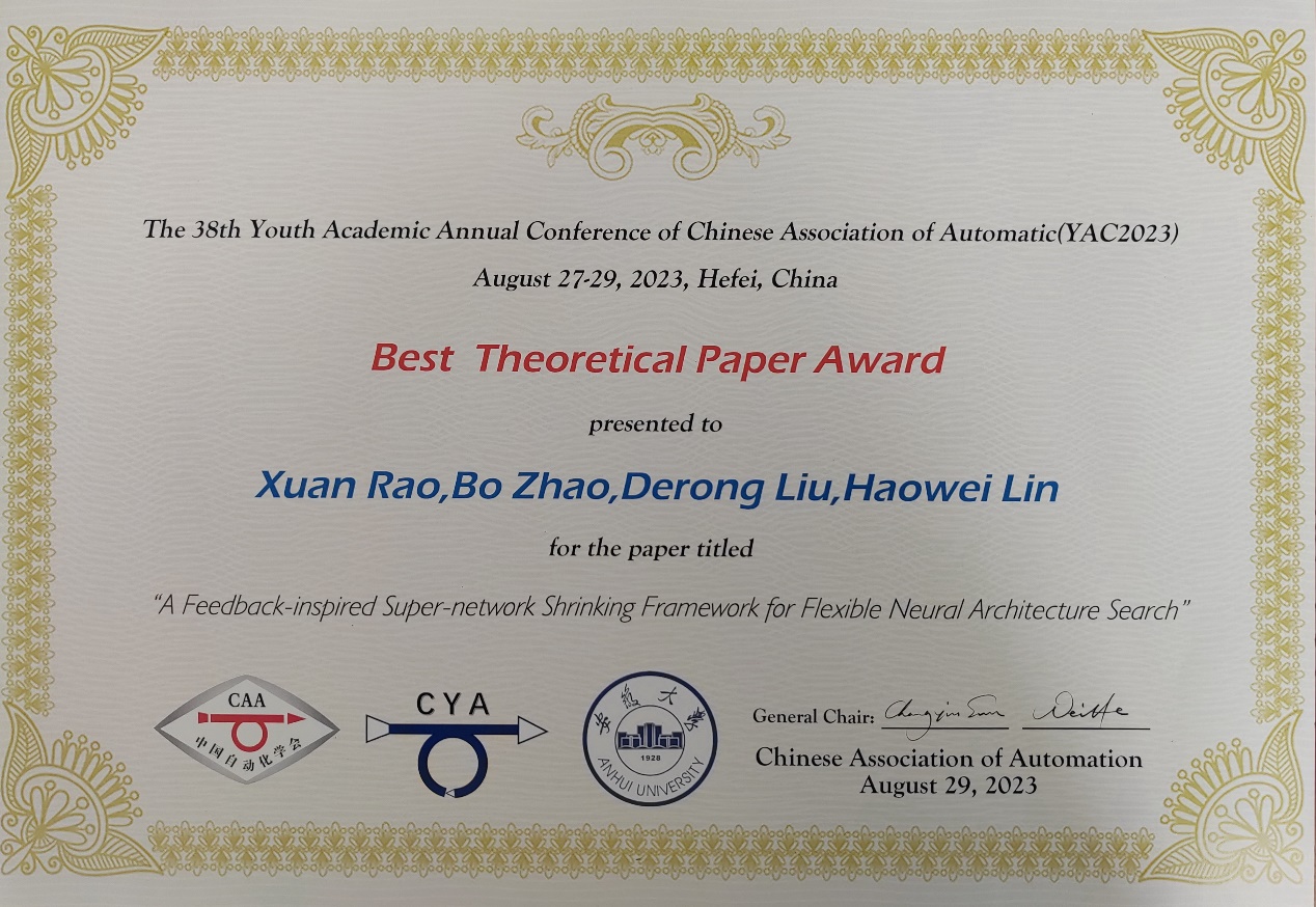 2023年8月27日-29日,在安徽合肥召开第38届中国自动化学会青年学术年会(YAC2023)。由日韩av 博士生饶煊、赵博副教授以及南方科技大学刘德荣教授(欧洲科学院院士)共同完成的论文《A Feedback-inspired Super-network Shrinking Framework for Flexible Neural Architecture Search》荣获最佳理论论文奖。
