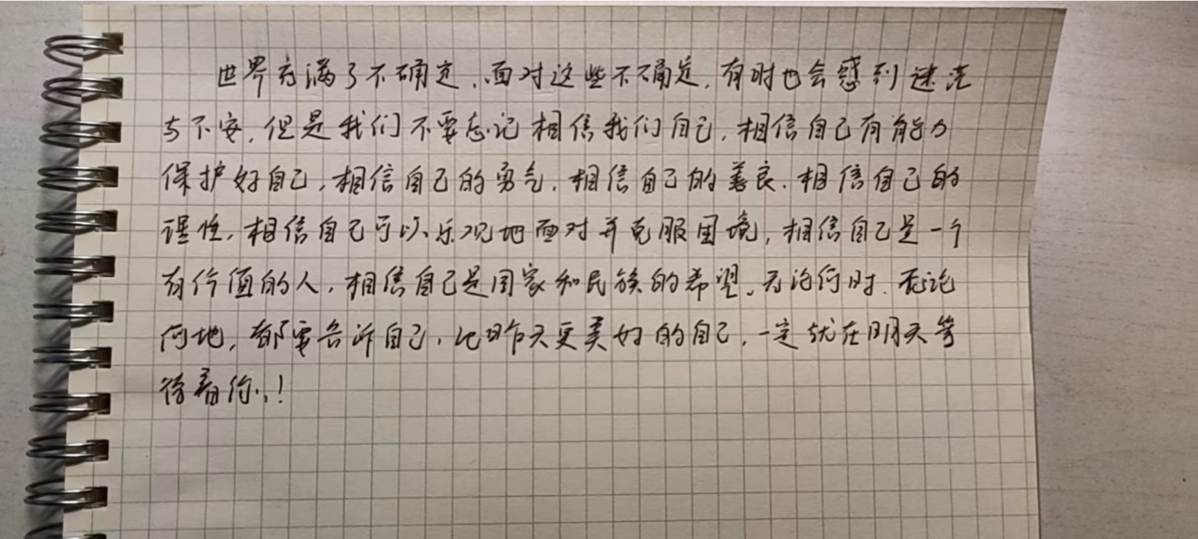 结合当前的防疫形势,张老师也在会上对大家进行了防疫教育。强调疫情防控压力依然很大,社会面形势仍不容乐观,在同学们积极配合学校隔离政策的同时,也希望大家保持乐观愉悦的心情。同学们也写下了自己的感受和期许。至此,此次会议圆满结束。
