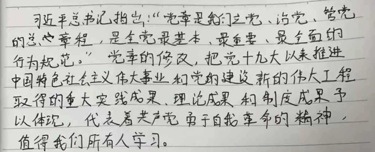最后,同学们交流了此次学习的体会,并以手写的形式留作记录。大家表示此次活动加深了自己对二十大精神的理解,同学们将认真学习不负韶华,不负这个大好的时代,踔厉奋发,勇毅前行。