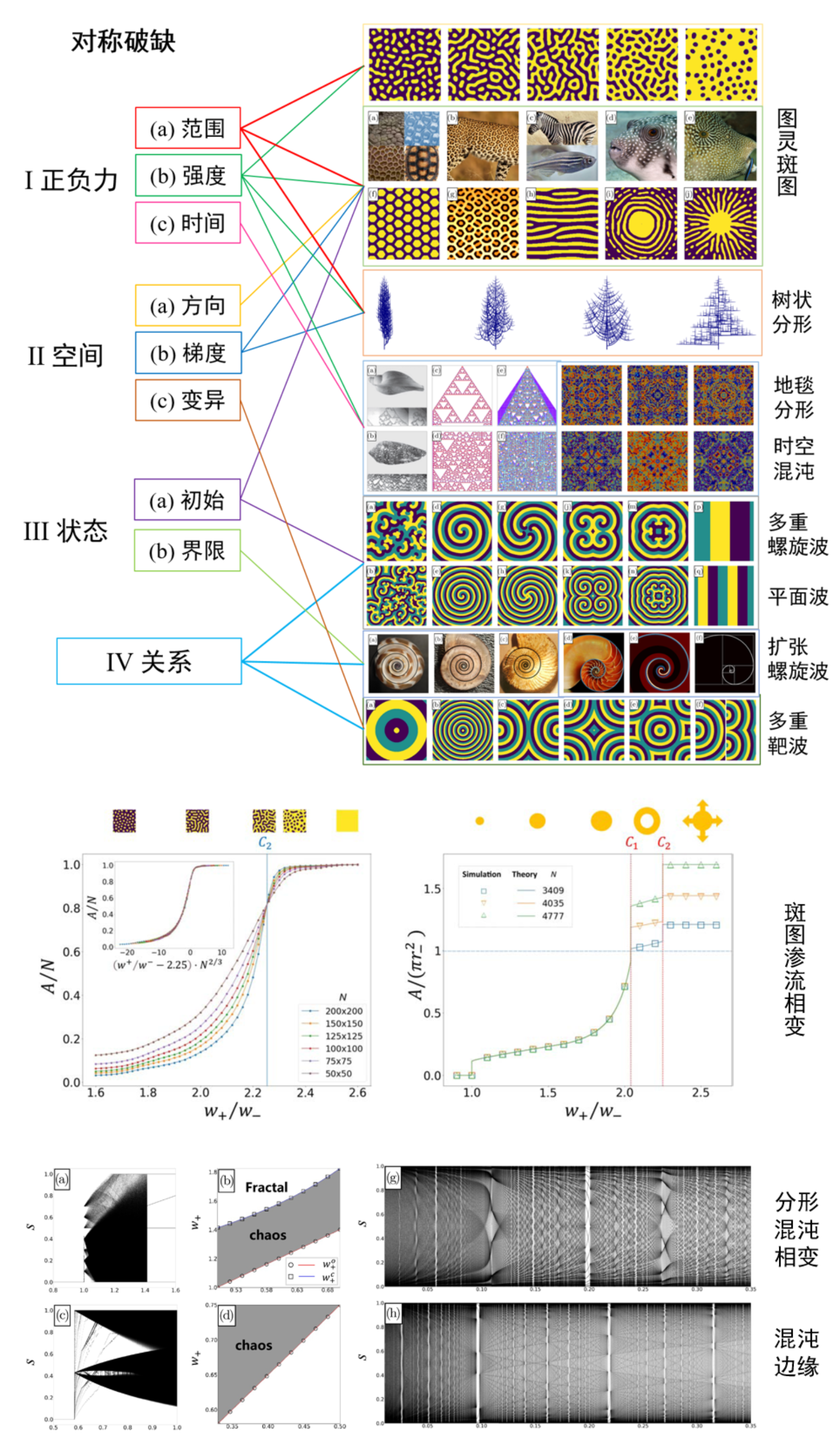 三条自组织规则的对称破缺组合能够产生自然界中的各种复杂现象和时空模式,包括各种图灵斑图(动物外表图案和玄武岩等)、分支分形(树、肺、河道)、地毯分形(海螺花纹)、螺旋波(阿米巴虫释放物质、化学振荡、海螺壳、飓风、星系)、靶波(心跳、生长因子)、平面波、时空混沌(混沌地毯和万花筒)、斑图渗流(非连续相变)、分形到混沌的相变(分形地毯到混沌地毯)、混沌和秩序共存(波的边缘混沌)等,具体发现如图3所示。在生成各种复杂现象的同时,课题组给出了斑图渗流相变的解析解、有限尺度标度分析、分形到混沌的相变解析解、螺旋波、靶波和平面波的各种特征的解析解(见表1)等。