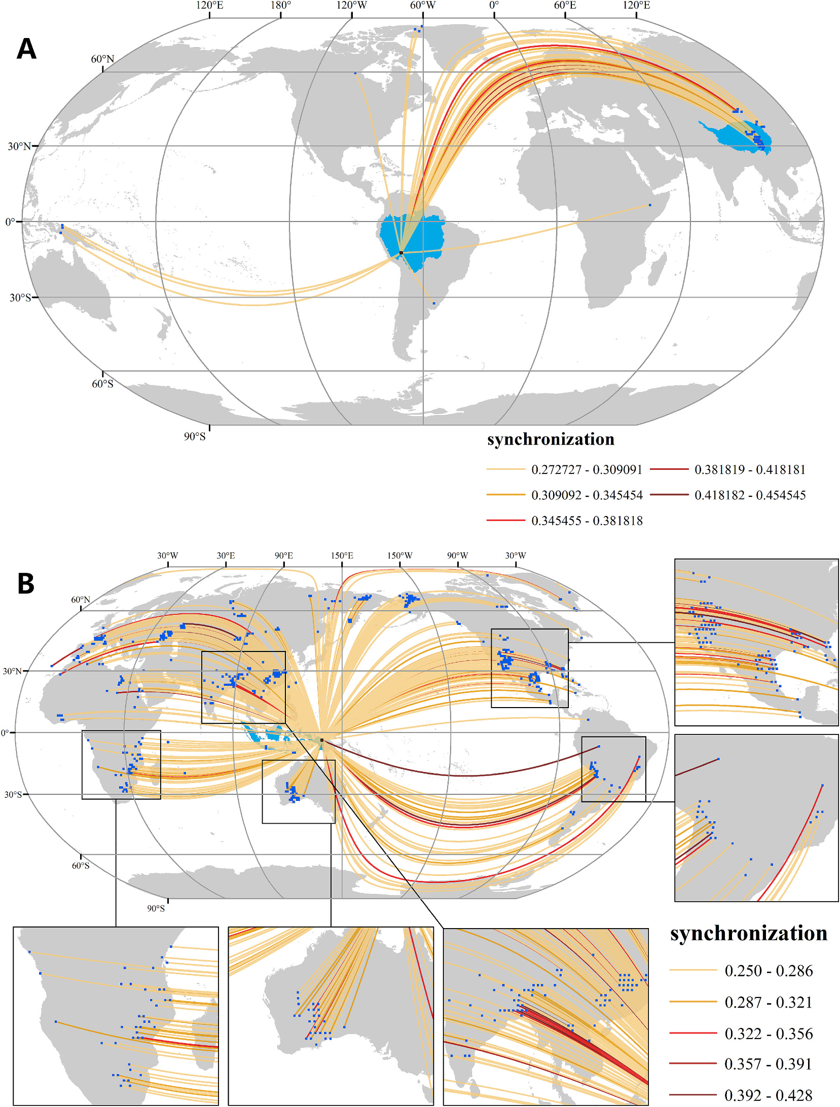 图1. 干旱遥相关网络中关键源区与汇区的连通路径映射